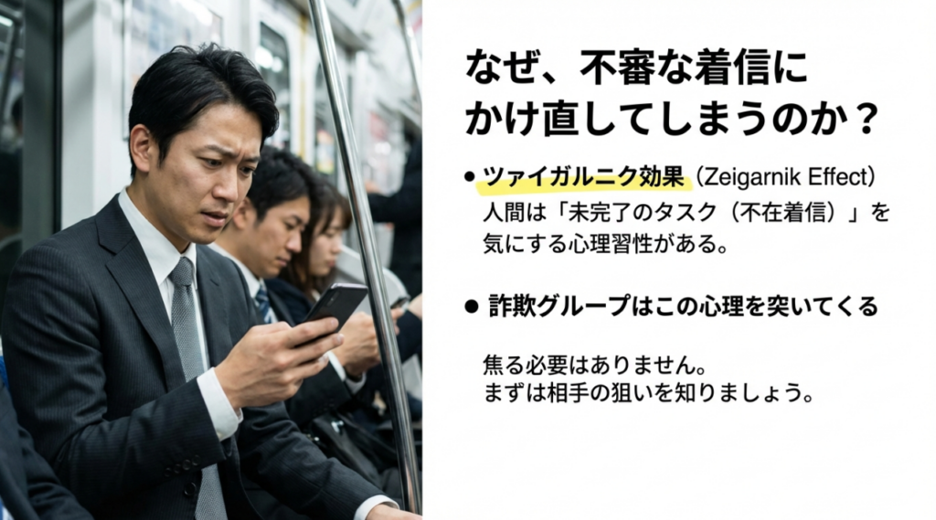スマホの画面に「不在着信」というバッジが赤く残っていると、私たちは無意識のうちにそれを「処理しなければならない未完了のタスク」として認識してしまい、ついタップして折り返してしまうんですね。詐欺グループは、こうした人間の無意識の認知バイアスを巧みに突いてきます。