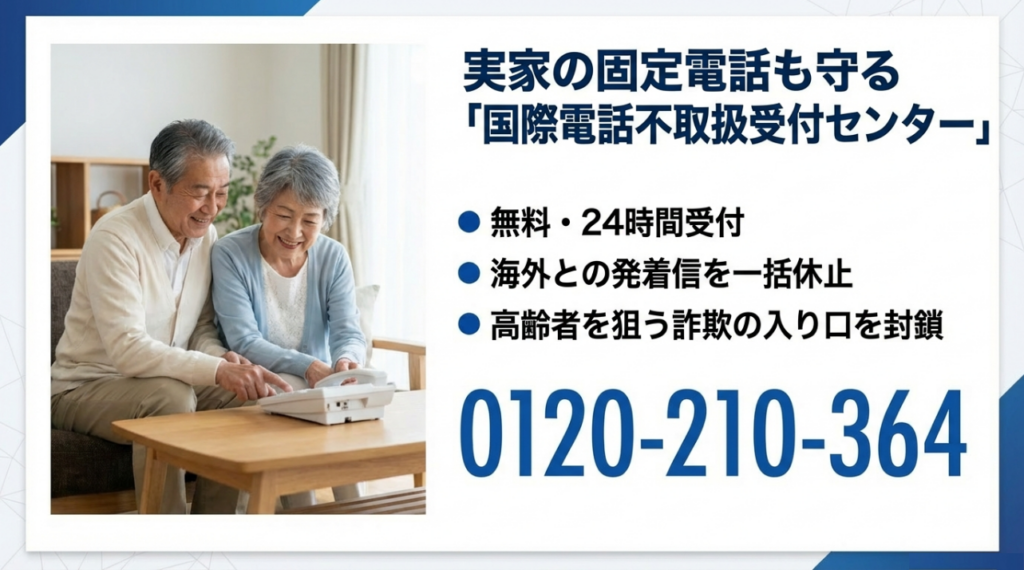 この社会的な課題に対応するため、通信事業者の垣根を越えて無償で手続きを代行してくれるのが「国際電話不取扱受付センター(電話番号:0120-210-364)」です。ここに申請を行うことで、固定電話からの国際電話の「発信」および海外からの「着信」の両方を、一括して休止させることが可能になります。