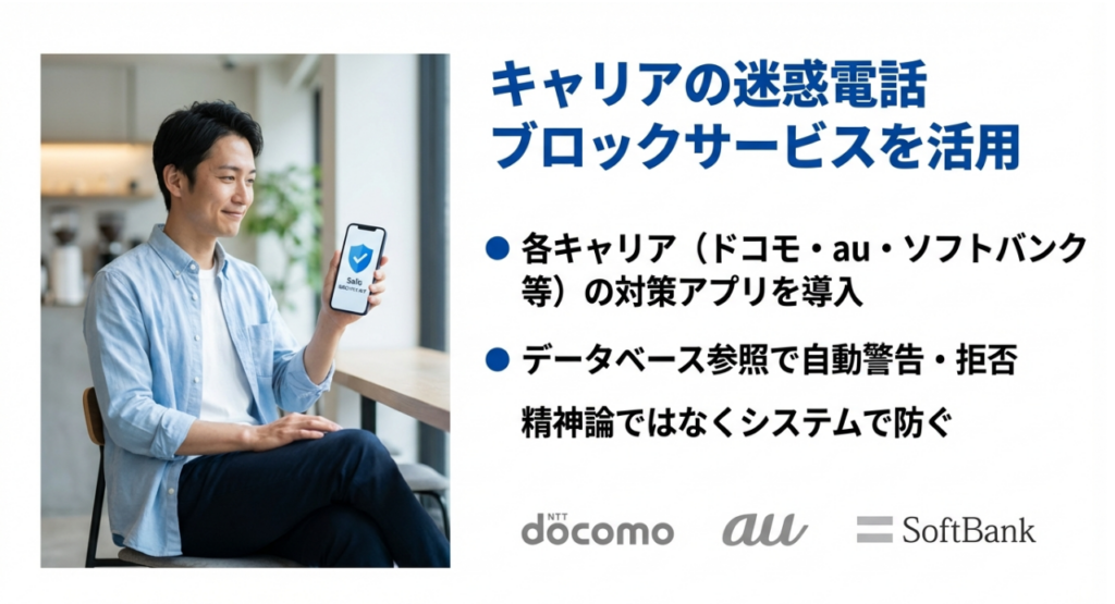 そこで最も確実で堅牢な防御態勢となるのが、ご自身が利用している通信事業者(キャリア)が提供している迷惑電話ブロックの専用サービスやアプリを導入することです。これらは、常に最新の迷惑電話データベースを参照して、ネットワークレベルで悪質なトラフィックを弾いてくれます。