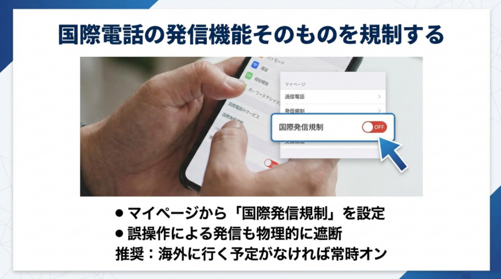 アプリによる着信拒否を設定しても、「間違えて着信履歴をタップしてしまい、再び海外へ発信してしまう」というヒューマンエラーのリスクは完全には消えません。人間は誰しもミスをする生き物ですから、意志の力に頼るのではなく、システム側で物理的に発信できないように蓋をしてしまうのが一番賢いやり方です。